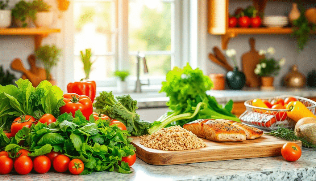 A well-stocked pantry is essential for healthy cooking. It should hold whole grains, canned beans, nuts, seeds, and diverse spices. These staples are fundamental for low-calorie meals and clean eating recipes. With these ingredients, you can whip up a plethora of nutritious dishes.